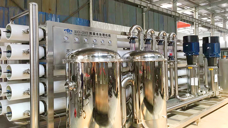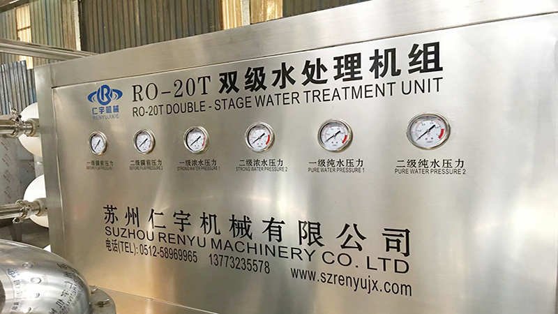 原水(自来水、地表水、地下水)加压送至预处理系统粗过滤,再进入精密过滤器过滤后,通过一级高压泵加压送至一级反渗透系统,该系统产出的水再由二级高压泵加压送至二级反渗透系统,生产出产品水,称为双级反渗透。