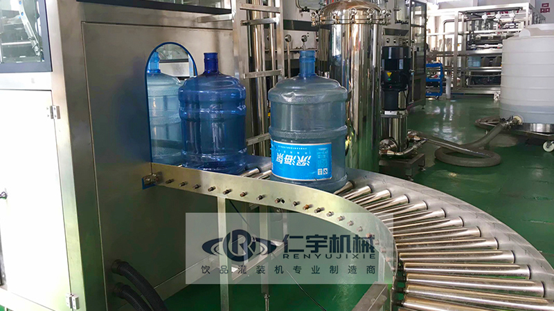 桶装水灌装机:集消毒、冲洗、灌装、封盖于一体,常规型12-18道优先清洗,每道冲洗时间为15秒。冲洗时间可以自动调节。在此过程中,桶的外部也利用喷嘴进行喷洗,将喷嘴往上升,深入空桶内部,对桶内部进行消毒、喷洗。通过自动下桶装置将清洗后的空桶送入灌装位置,并进行灌装,过程中溢出的水将回流到纯水箱,避免成品水的浪费。灌装后的大桶由输送链带其依次进行挂盖和封盖。